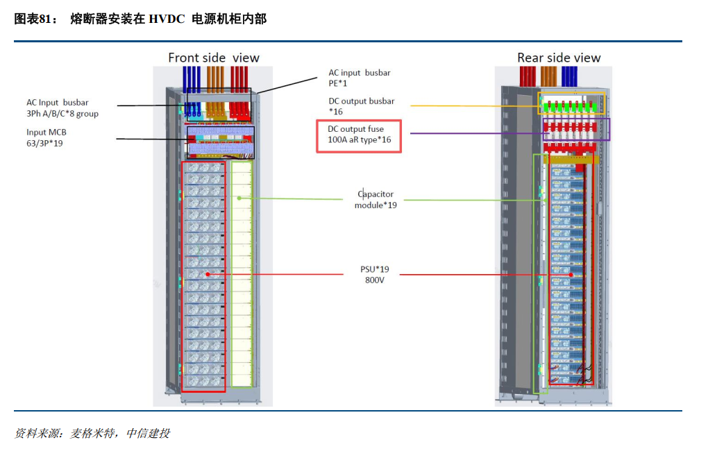 HVDC系统的电源模块而言,主要由功率器件与功率模块、磁性元件与电容、检测/控制与监控、配电、机柜与内部铜排/布线等单元组成。高压电源架构中,断路器、熔断器是配电单元中必不可少的器件。在800V高压化趋势下,超级电容、BBU等电力电子器件亦成为必选项。