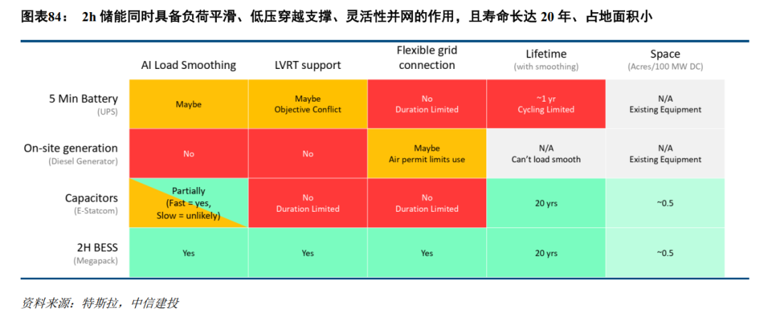 与UPS、柴发、电容器等手段相比较,特斯拉认为2h电池储能系统在AI负荷平滑、低电压穿越支撑、灵活并网方面都具备优势,而其他手段只具备1-2种功能,且电池储能系统还具备寿命长、占地小的优势。同时,Fluence在其25财年Q4季报说明会上也认为,电池储能系统有助于提升数据中心的并网灵活性、能够作为数据中心的备用电源,还可以提升电能质量、平滑负荷波动。其中,Fluence指出并网灵活性是数据中心配置储能最重要的驱动力,配储后数据中心才能满足电网的可用性要求,能够保证数据中心不会对电网造成负面影响,从而加快并网程序的推进。