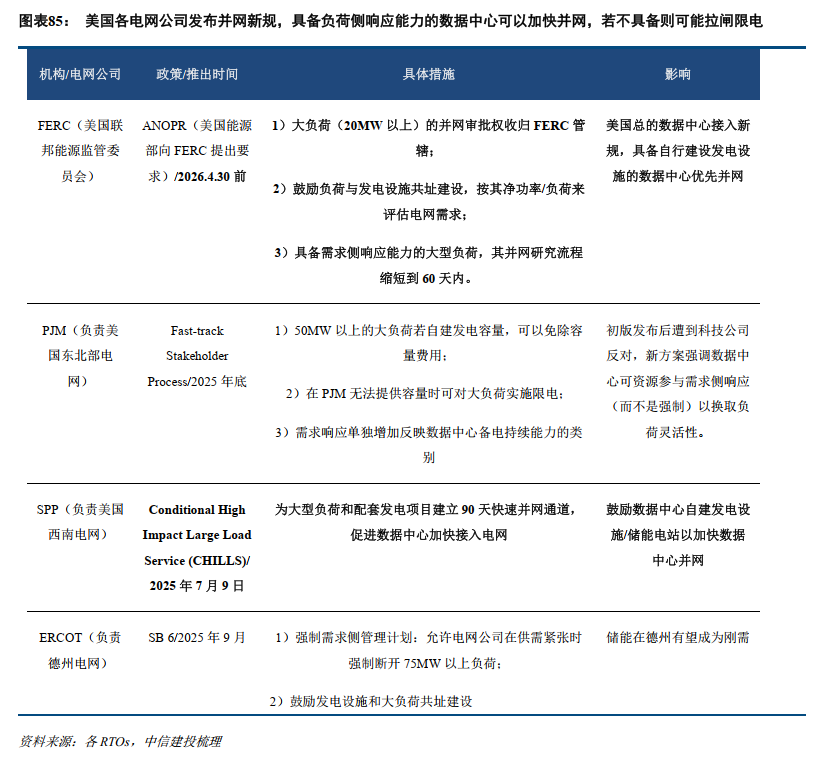 针对美国数据中心爆发式增长,大型负荷接入电力系统将对安全可靠性造成影响,美国能源部(DOE)致函美国联邦能源监管委员会(FERC),要求启动新并网规则的制定,以“加快大型负荷的并网”。此前主要矛盾在于,新建发电设施的并网流程由FERC管辖,而大型负荷的并网则由各州自行负责,因此存在明显的脱节。美国能源部的信件认为大型负荷的管理方式应与发电厂一致,且均应由FERC进行管辖,确保大型工业负荷和数据中心能够及时、无歧视地接入电力系统。特别提到,若负荷具备灵活性且可削减(即需求侧响应能力),其并网研究(并网前的必备流程)应在60天内完成。因此若数据中心配置储能,作为大型负荷就具备了需求侧响应能力,能够加快并网流程的实施。目前FERC正就此事进行政策制定,预计将于2026年4月30日发布。