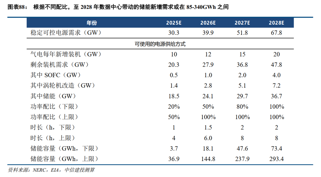 我们此前已在报告《数据中心拉大美国电力装机需求,光储、SOFC是目前可行的解决方案》和《再论AIDC配储是解决北美电容量缺口的必然选择》中详细论述了北美缺电现状。即使考虑SOFC、退役航发改燃机后,对储能的需求仍高达85-340GWh之间(2028年新增量),取值浮动范围较大,主要因未来配储功率、时长比例不确定。若未来美国采取高比例绿电直供方式为数据中心供电,时长有望取到6-8h;即使只是起到加快并网、改善电能质量的作用,时长也需达到2-4h。
