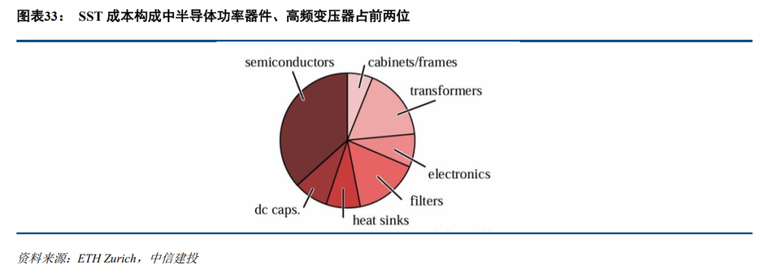从成本拆分来看,固态变压器成本主要由功率半导体、高频变压器、直流电容、散热系统等组成。其中,功率半导体器件成本占比达到30-40%,高频变压器成本占比10-20%;半导体器件、高频变压器为SST核心器件。