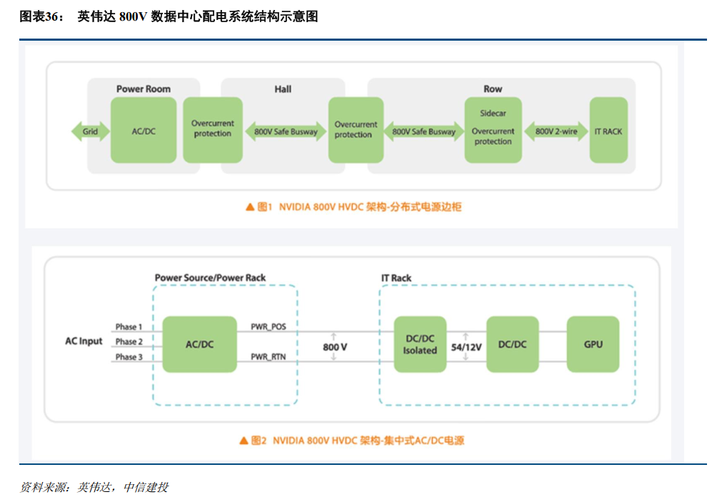 HVDC系统已明确向800V等高压化迈进。英伟达明确提出未来800V HVDC架构,产品形态包含两类,1)分布式电源边柜Sidecar,内置储能锂电BBU和超容CBU,输出800V HVDC,且至少末端的800V HVDC是稳电压输出。2)电源间放置的直连电网的集中式AC/DC中压直流电源,输出800V HVDC,Server输入电压为800V,两级DC/DC转换为54V /12V至GPU。同时整个供配电链路包括直连电网的集中式AC/DC电源、新型过流保护装置、800V HVDC安全母线(金属屏蔽层 惰性气体密封)、分布式电源边柜Sidecar,为邻近的IT机柜提供800V HVDC供电。