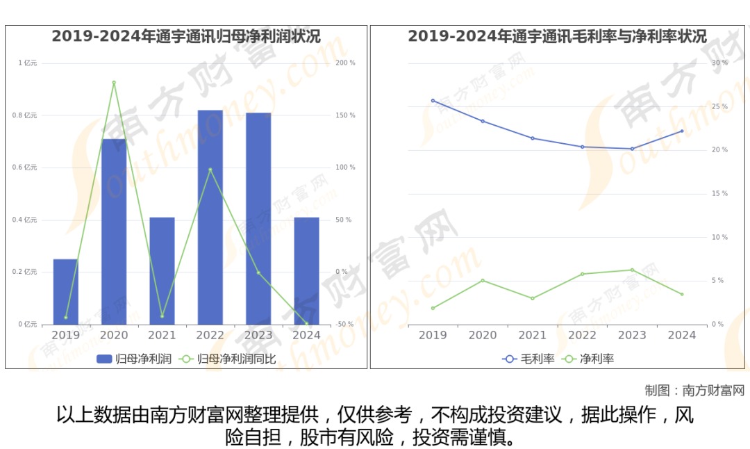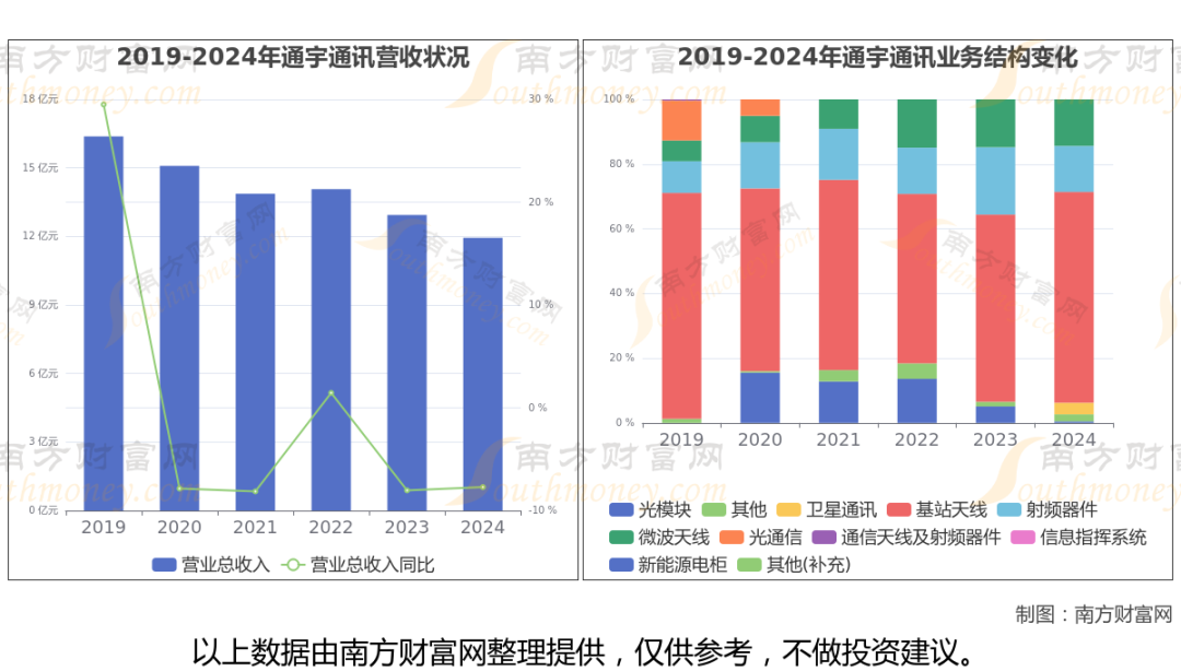 (如上图)2024年通宇通讯公司营业总收入11.94亿,同比增长-7.71%,近五年复合增长率为-5.69%。