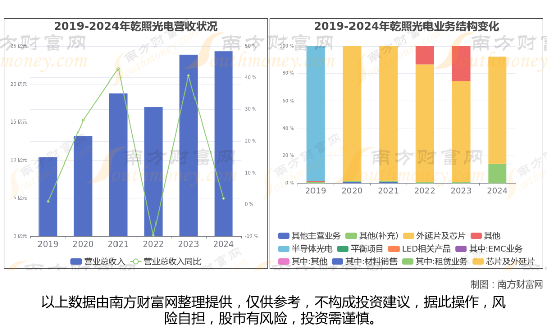 (如上图)2024年乾照光电公司营业总收入24.33亿,同比增长1.91%,近五年复合增长率为16.61%。
