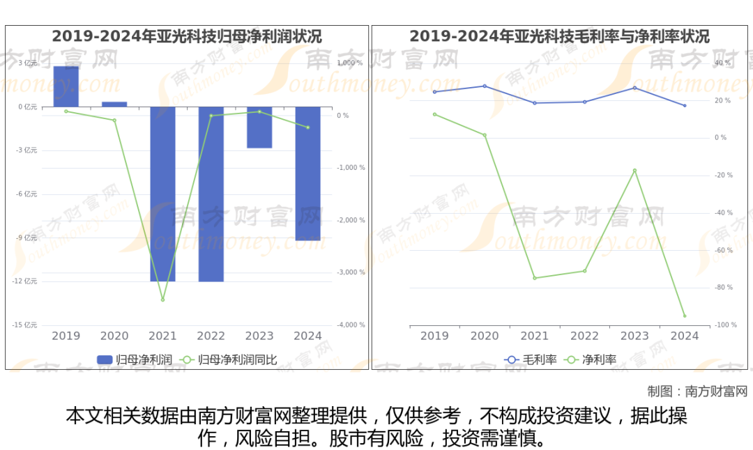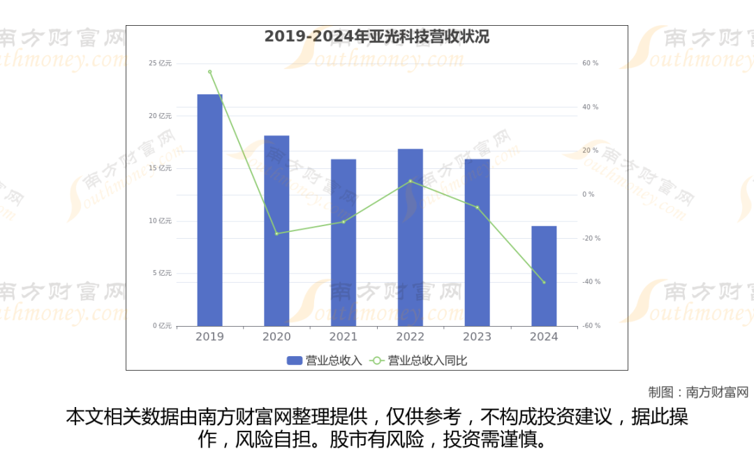 据年报数据显示(如上图),亚光科技过去一年实现营业收入9.52亿,同比增长-40.08%,近5年复合年增长率-14.87%。