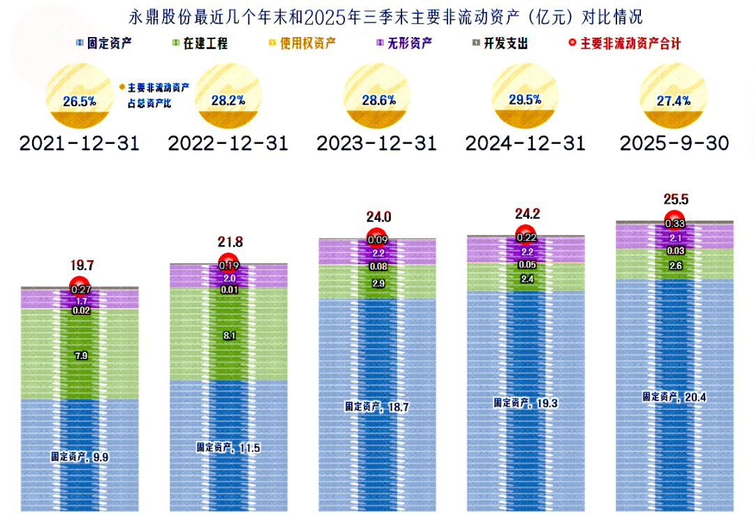 前几年固定资产的增长还比较快,从2024年末以来都处于低速增长状态。这和其投入强度下降有关,也和其资产折旧规模变大有关。