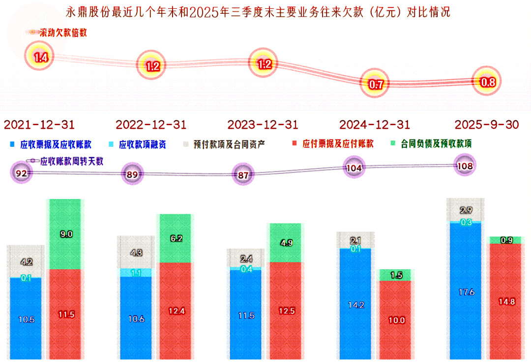 几年时间,往来欠款方面发生了颠覆式的变化,2021年末是欠款多占别人四成,2025年三季度末就变成了需要多垫款两成,主要影响因素是“合同负债”。