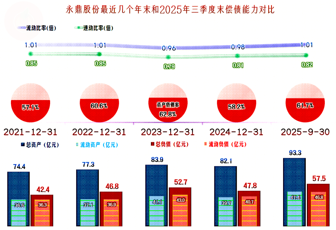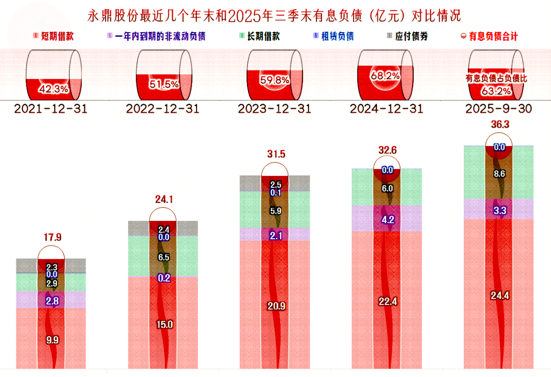 由于进行子持续的有息负债的融资,永鼎股份的有息负债规模从2021年的不到18亿元,增长至2025年三季度末的36.3亿元,刚好翻倍。对一家总资产规模不到百亿元的公司来说,这样的有息负债规模已经偏高了。