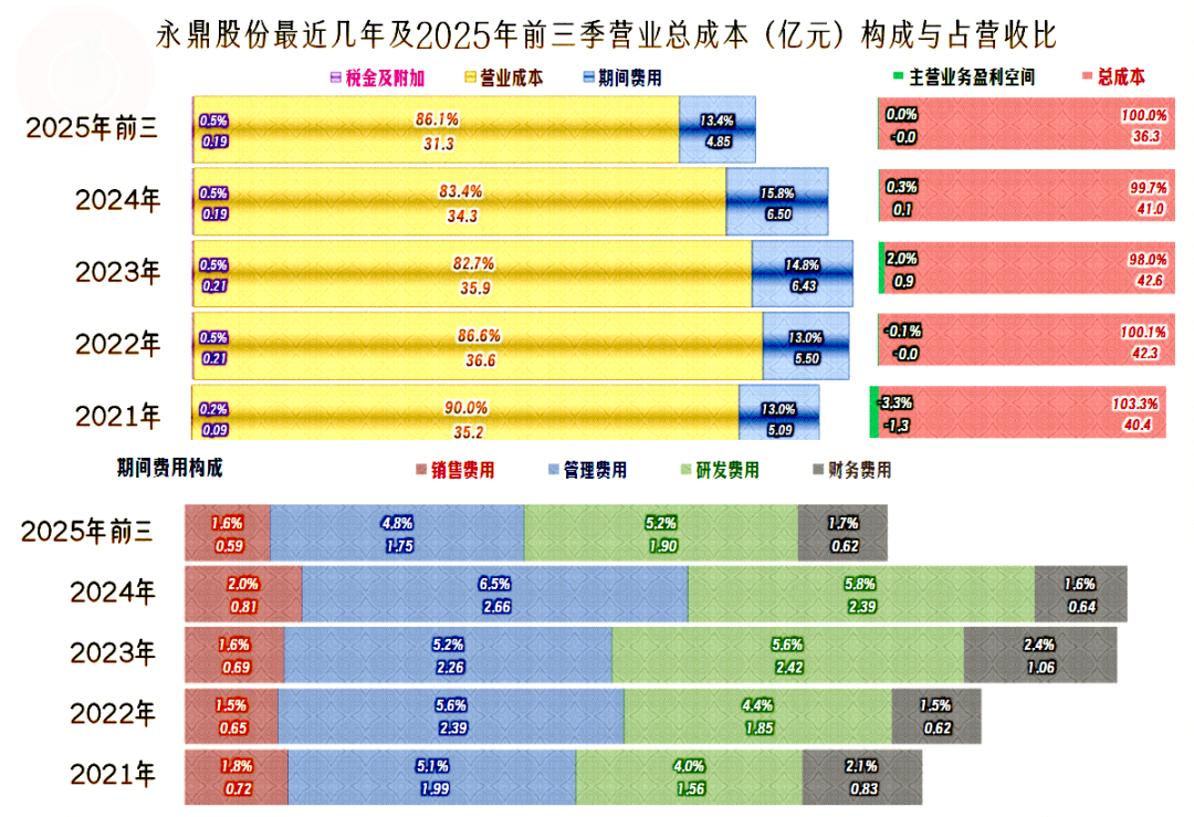 营收呈平台状增长,实际增长有限;但期间费用却按照增长的预期在安排,这就导致2024年及以前,每一年的期间费用占营收比都在上升。2025年前三季度营收的同比大幅增长还是有用的,虽然13.4个百分点的期间费用占营收比,仍高于2021年,但却比2024年下降了很多。如果不是期间费用比较争气的话,2025年前三季度的主营业务又会出现亏损了。