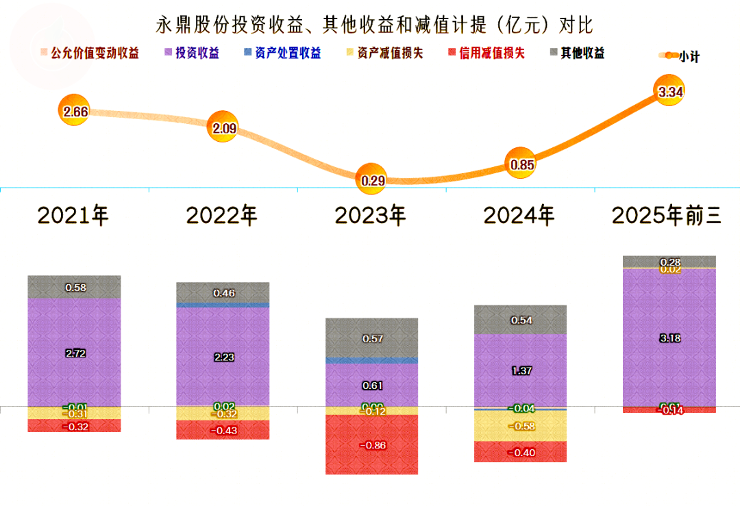 其他收益方面的表现相当好,每一年都是净收益的状态。2021年和2022年都超过了两亿元,主要是“投资收益”比较高。2023年和2024年的表现相对差一些,不仅因为投资收益下降,还因为“资产减值损失”和“信用减值损失”比较高。2025年前三季度的表现更好了,主要就是其投资收益又重新大幅增长了。