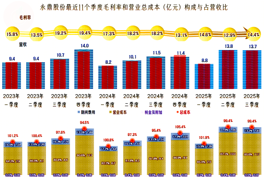 如果仅看季度的主营业务盈利情况,2025年一季度其实是亏损状态,除此之外,每个季度的主营业务盈利空间都是比较小的。2023年和2024年都有两个季度出现主营业务亏损,2025年以来,虽然看起来只有一季度出现主营业务亏损,但二季度和三季度的主营业务盈利空间都不到1个百分点,实际上的主营业务盈利情况,甚至还不如2024年。
