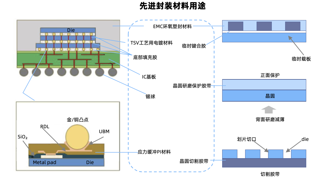 先进封装相对传统的变化主要在于对减薄/抛光要求提高和新增RDL、Bumping、TSV环节,主要包括电镀液、临时键合胶、PSPI等。