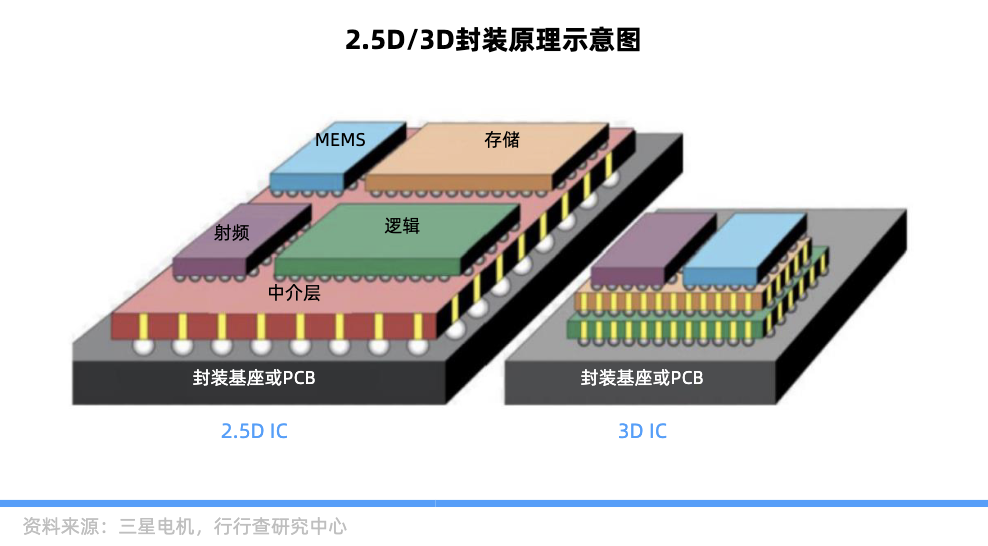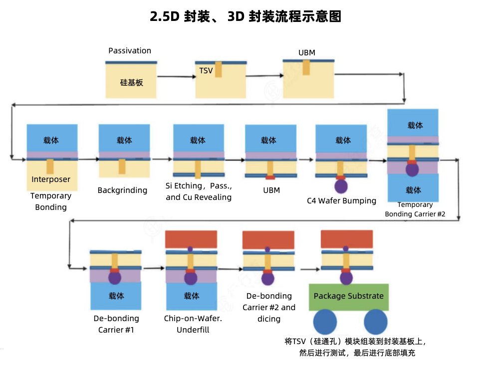 2.5D封装:介于2D和3D封装之间的技术,将处理器、存储等若干芯片并列排布在中介层上,利用RDL、硅桥、硅通孔(TSV)等技术实现更高密度的互联。采用台积电CoWoS封装形式的英伟达GPU芯片是2.5D封装技术的典型代表,已经实现大规模量产。