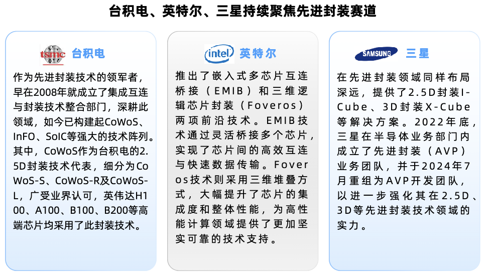 IDM(垂直一体化)类厂商:如英特尔和三星,能够提供芯片设计、制造和封测一站式服务。英特尔拥有EMIB 2.5D、Foveros 3D、EMIB 3.5D、Foveros Direct 3D等多种先进封装技术;三星在先进封装领域有深厚的技术积累,如2.5DRDL(再分布层)技术。