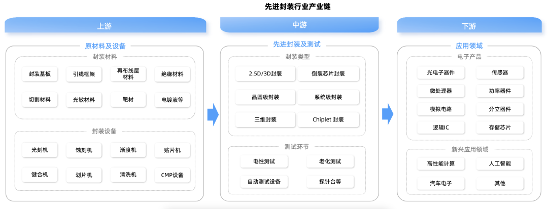 先进封装产业链包括上游原材料及设备、中游封装和测试以及下游应用。