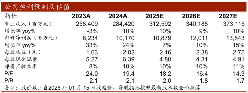 结合目前经营情况及后续展望,我们调整盈利预测,预计公司2025-2027年实现归母净利润分别为108.79、120.11、138.43亿元(原预测值分别为111.63、127.43、147.95亿元),每股收益分别为2.16、2.38、2.75元,对应1月15日收盘价的PE分别为18.2X/16.4X/14.3X,维持“买入”评级。