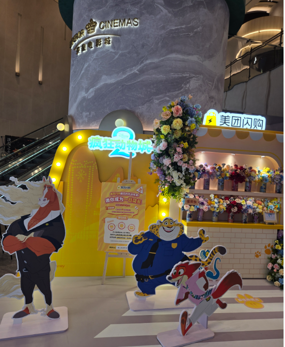 在电影院显眼位置摆放着《疯狂动物城2》的宣传物料。