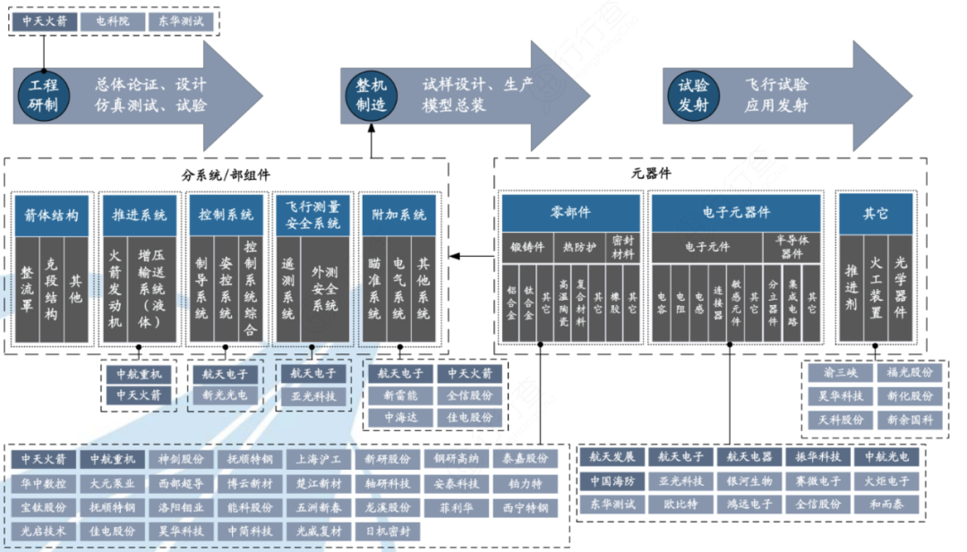 运载火箭制造产业链及部分相关公司: