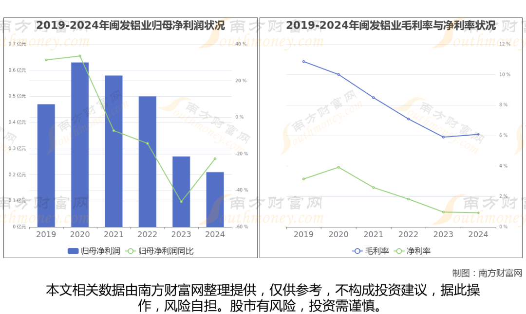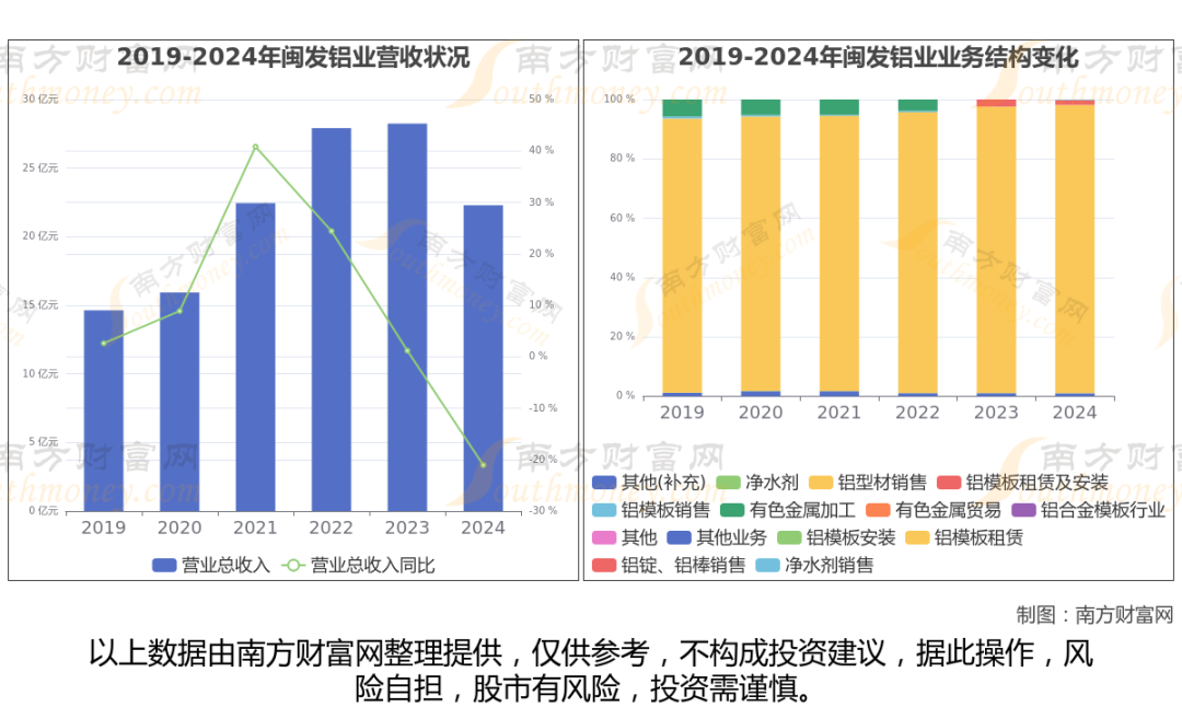 闽发铝业财务数据显示(如上图): 2024年实现营业总收入 22.29亿,同比增长-21.07%。近五年复合增长率(CAGR)为8.76%。