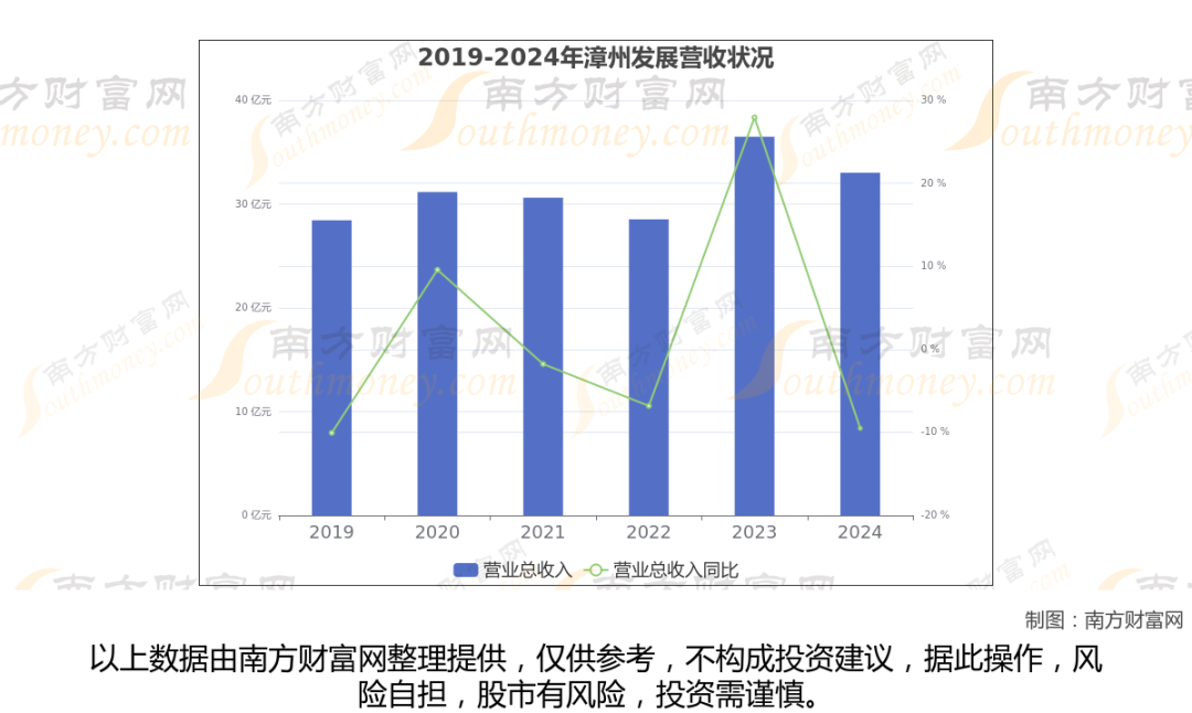 数据显示(如上图),漳州发展2024年营业收入为33.02亿,同比增长-9.51%,近5年复合年增长率1.46%。