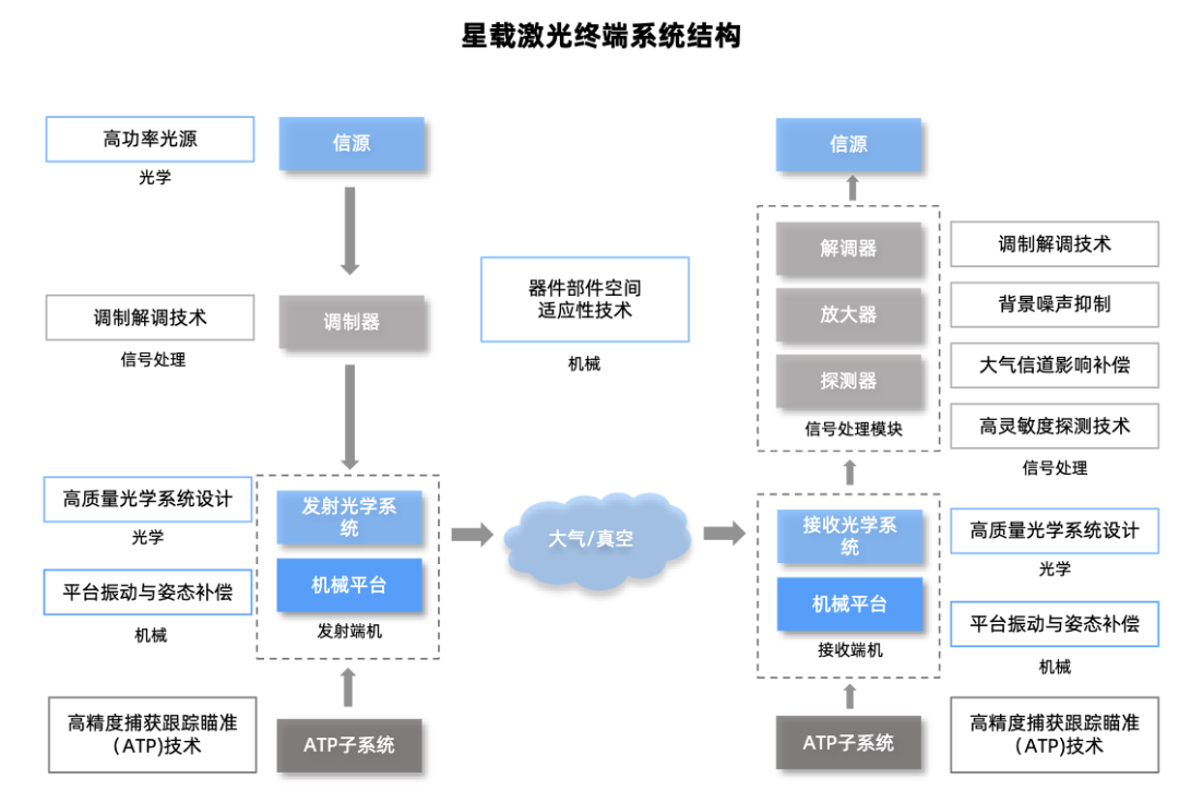 该系统主要由多个子系统构成,包括激光收发系统、捕获跟踪瞄准(ATP)系统、光学系统,以及配电系统、热控系统等配套系统。