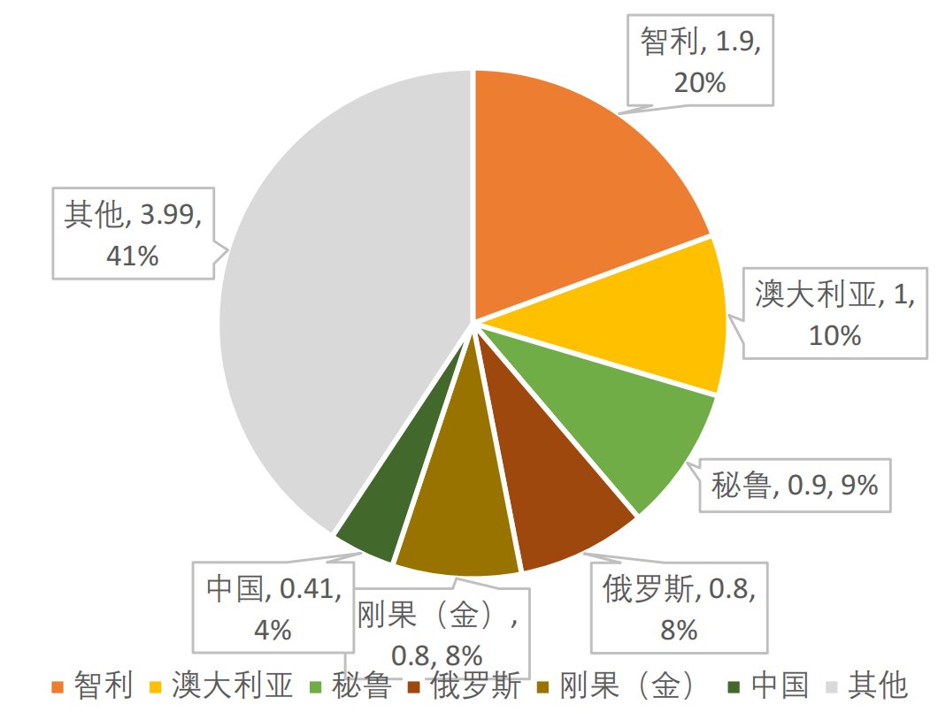 ② 澳大利亚:1 亿吨,占全球 10.2%,主要矿区:Escondida、Collahuasi等,与秘鲁并列第二;