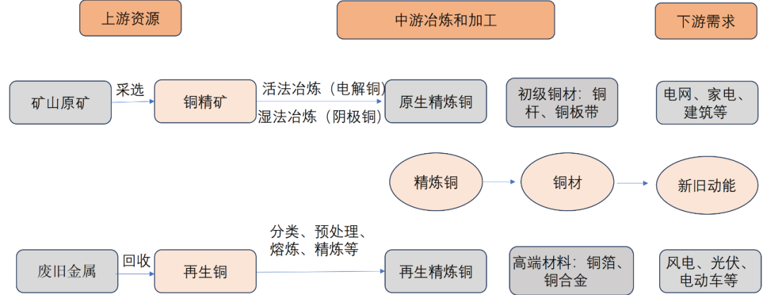 上游是产业链的源头,主要负责获取铜的原始原料,包括 矿产铜 和 再生铜 两大来源。
