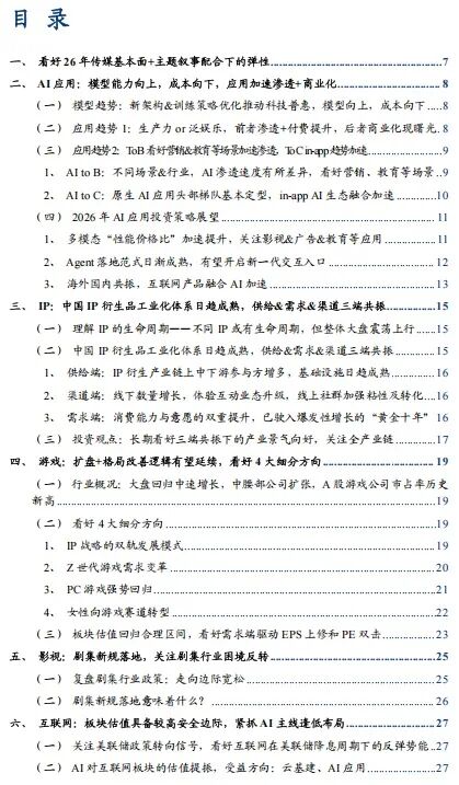 AI:从底层模型角度看,回顾2025年,不同模态的底层模型在持续迭代,新模型架构和训练策略优化推动大模型普惠。展望2026年,各单一模态有望在垂直领域、精细化落地;逐步实现原生多/全模态,AI实现统一感知理解与生成,智能化能力大幅度跃迁。从应用趋势角度看,我们认为,①生产力方向的AI应用有望在2026年加速在B端的渗透,并提升C端付费;而泛娱乐探索的AI应用探索我们观察到在2025年底初现曙光(如AI漫剧跑通商业飞轮,实现ROI转正),或有望在2026年加速成长。②To B应用看好营销&教育等场景加速渗透,To C in-app趋势加速,互联网集团聚焦”AI 业务场景“的融合;手机厂商布局“系统性生态融合”。从投资策略角度看,①多模态“性能价格比”加速提升,关注影视&广告&教育等应用;②Agent落地范式日渐成熟,有望开启新一代交互入口;③海外国内共振,互联网产品融合AI加速,建议关注腾讯、阿里等。