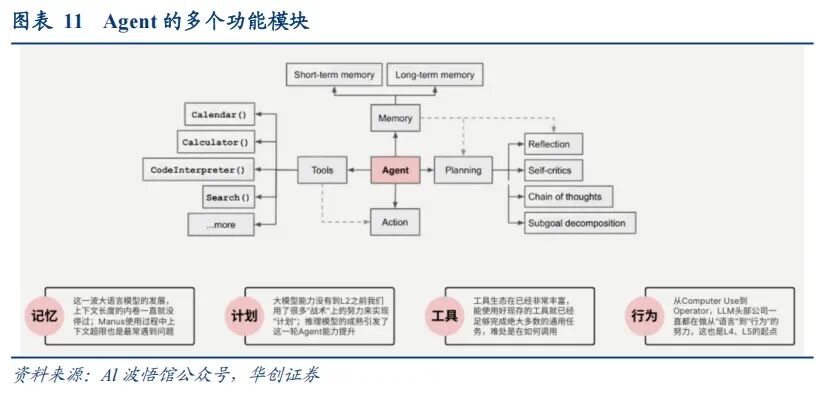 从技术迭代视角看,智能体化演进,构建主动学习与协同决策的新范式。将大模型从被动响应的认知工具进化为能自主规划、执行与反思的智能体(Agent),具备目标驱动的任务分解、资源调度与持续学习能力。智能体将成为AI生态的核心运行单元,推动人工智能由单体模型向多Agent协同系统演化。AI Agent下一步的竞争点或在于对外部工具的调用能力,也即最终可执行任务的多样性和稳定性。