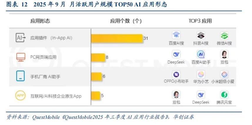 随着不同大模型定价机制持续优化,用户使用黏性持续上升,尤其是“应用插件”模式,已经跃居增长榜首,展望2026年来看仍是科技大厂的最重要产品化趋势。具体来看,2025年9月,月活跃用户规模TOP 50的AI应用中,In-App形态的插件应用占到31个,前三位的分别为百度AI搜、抖音AI搜、微信AI搜。