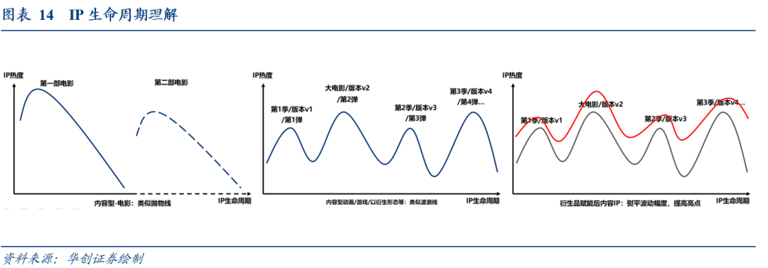 内容型IP:①电影IP类似扔石头的抛物线,往往在电影上映(扔出石头的刹那)热度最高,伴随电影下映热度往往骤减,我们认为这是电影这种偏一次性的内容形式导致,如果有第二部(不一定有,用虚线表示),高点较前次则或高或低(超越前作/烂尾);②动画/游戏等IP类似波浪线,伴随每一季内容/每一次版本更新,赋予IP更多的内容与更新,热度如波浪上下波动,但生命周期相较电影或更长。
