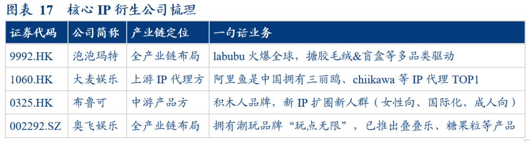 中国已逐步形成了IP衍生产业链的上中下游,并在其中孕育如泡泡玛特、奥飞娱乐等全产业链布局的公司,也成长出许多深耕特定产业链环节的上游IP方(如光线传媒、阿里鱼、阅文集团等)、中游开发出品方(精耕卡牌品类的卡游、积木品类的布鲁可、谷子品类的广博股份等)及下游渠道方(如名创优品、酷乐潮玩等),产业链多方协同驱动行业整体景气度向上。