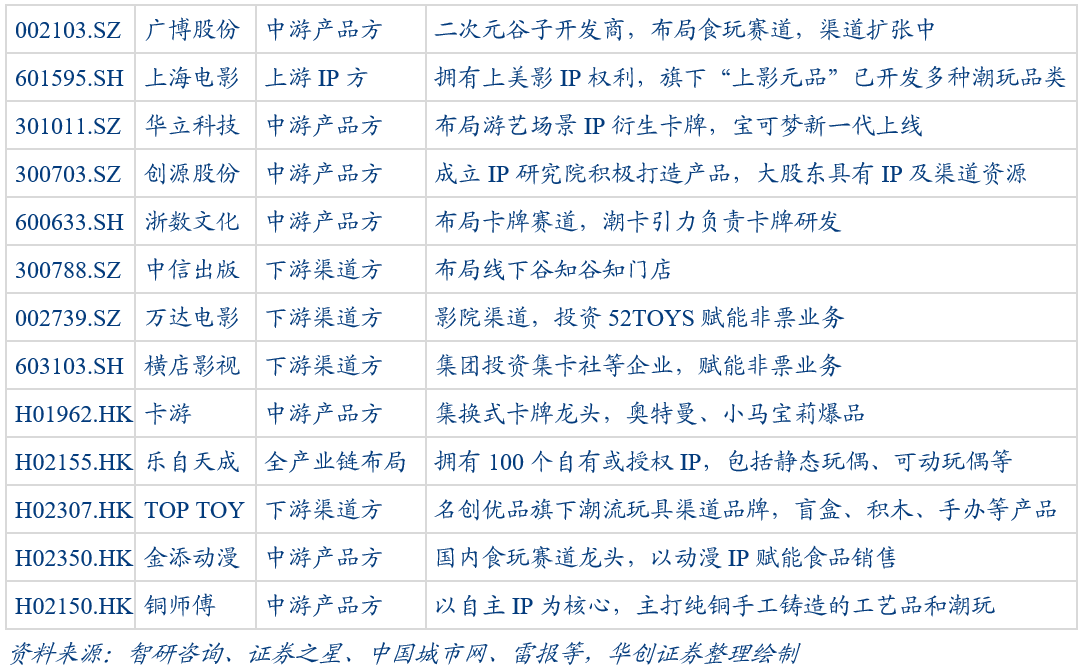 IP:中国IP衍生品工业化体系日趋成熟,供给&需求&渠道三端共振,驱动产业景气度长期向上。①供给端看,我们认为中国已逐步形成了IP衍生产业链的上中下游,多方协同驱动行业整体景气度向上;②渠道端看,线下数量增长,体验互动业态升级,线上社群加强粘性及转化;③需求端看,消费能力与意愿的双重提升,或已驶入爆发性增长的“黄金十年”。我们看好上游IP方的长期价值,建议关注中游制作方的eps兑现及下游渠道方运营能力。建议关注泡泡玛特、广博股份、大麦娱乐、奥飞娱乐、华立科技、布鲁可等。此外建议关注迈入交表上市阶段的卡游、乐自天成、TOPTOY、金添动漫、铜师傅等。
