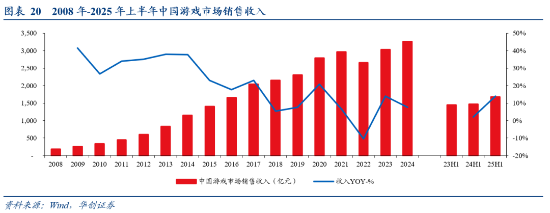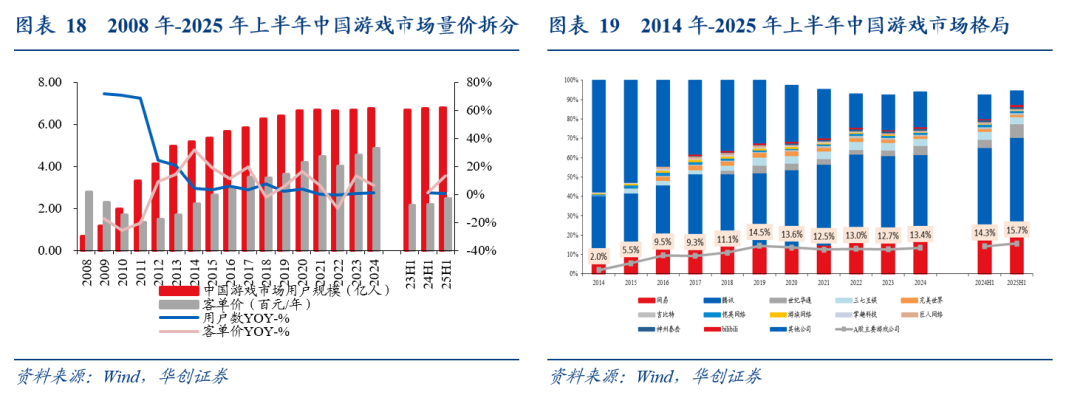 品类创新和降肝减氪,驱动客单价提升,回归中速增长状态:国内游戏行业经历疫情期间“居家经济”爆发期和22年版号停发的下滑期之后,近三年恢复到温和扩张状态(23年14%,24年8%,25H1 14%);疫情之后用户量基本稳定,时长24年波动后稳定,主要驱动力都来自于平均客单价提升。