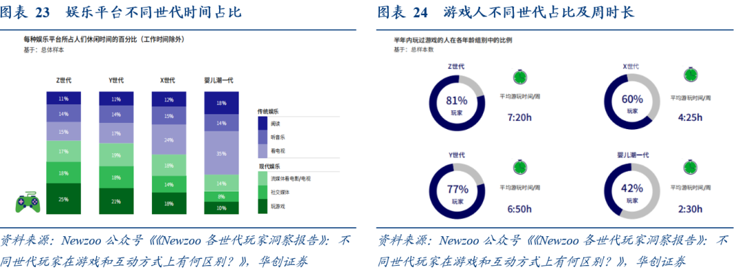 Z世代游戏需求变革核心逻辑在于:一代人有一代人的"传奇",每一代用户的娱乐偏好深刻反映其时代特征与精神需求。根据Newzoo《各世代玩家洞察报告》的数据,我们认为:1)Z世代中有 81% 的人在玩游戏。2)Z世代玩家把休闲时间的25%用在玩游戏上。年轻一代(Z 世代和千禧一代)在游戏上花费的休闲时间比在任何其他娱乐媒体上都多。3)Z世代每周花7小时20分钟玩游戏,比Y世代的平均时间多半小时。4)Z世代在移动端具有高消费占比。
