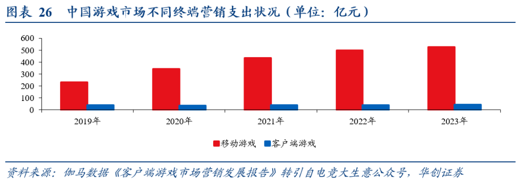 我们认为,PC回归或是必然趋势。中国游戏市场已进入成熟发展阶段,用户规模稳定在约6.8亿人,年同比增速降至1%以下。存量用户审美端必然会有从小程序→APP→PC/主机的审美升级(本质上是上述升级路径中,游戏操作深度和内容/画质等均会有质的提升)。《黑神话:悟空》已带来一波国产设备的“购、换机潮”,用户存在新设备购入后的边际增量需求。伽马数据2023年客户端买量数据报告显示,2023年PC端买量支出仅40.48亿元,同年移动端买量支出527.22亿元,目前PC买量竞争远低于移动端,PC买量支出相对优势明显,且三端互通更易辐射手游端,形成买量协同。