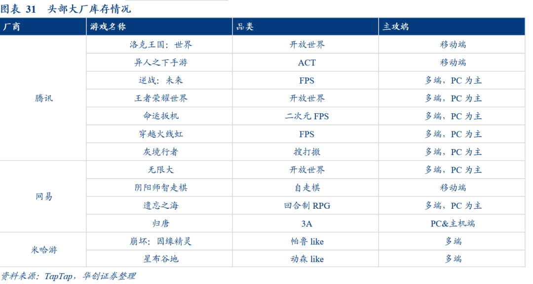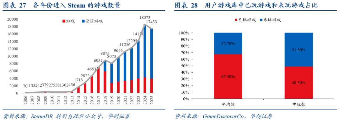 供给端呈现出前所未有的繁荣景象,PC独游是一个更加值得重视的赛道。SteamDB基于官方API数据统计,2024年Steam平台共发行18573款新游戏,同比增长近32%。《黑神话:悟空》后国内PC独游等立项亦显著增加,未来几年或将进入陆续释放之年。PC独游是一个更加值得重视的赛道。一方面PC独游本质上是一个扩市场而分时长的过程, Steam玩家库存中位数显示:超半数游戏(51.5%)永久吃灰,平均未游玩率高达32.7%,或表明市场更愿意为收藏/优质游戏确定性买单。