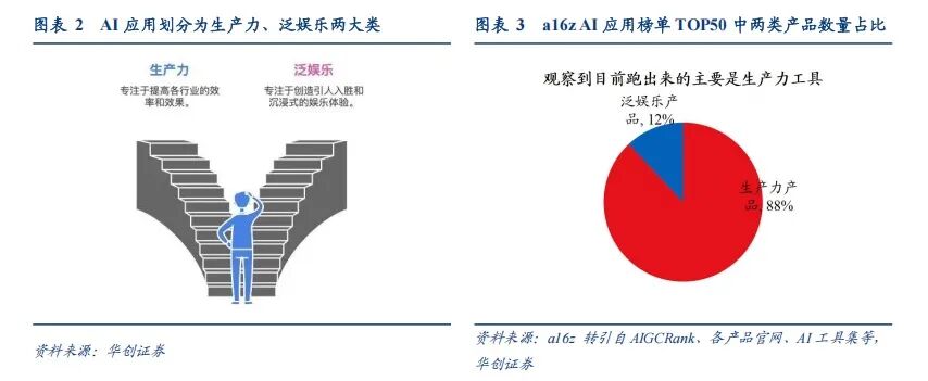 为什么会产生这种产品迭代上的进度差异?我们认为,生产力AI应用作为工具,更多体现当前阶段技术能力的上限,其迭代基本与近两年技术突破保持同步,即生产力AI应用主要由技术进步驱动,这也是新产业发展初期的主要突破点。与之不同,泛娱乐AI应用由技术和产品设计共同驱动。人类的娱乐需求具有恒常性,只是随着技术发展,不断被各种新形态所满足。我们认为,当新技术能够满足新需求,或能更优质地满足已有需求时,便会催生出新的泛娱乐产品形态;反之,则原有形态得以保留。技术进步后,确定满足何种需求以及如何满足需求,都需要经历探索过程,因此泛娱乐AI应用的迭代进度相对较慢。不过,我们注意到,在满足陪伴需求、以及AI内容消费等细分领域,产业已取得一定成果,且有望催生一系列泛娱乐产品新形态,开拓新的市场空间。