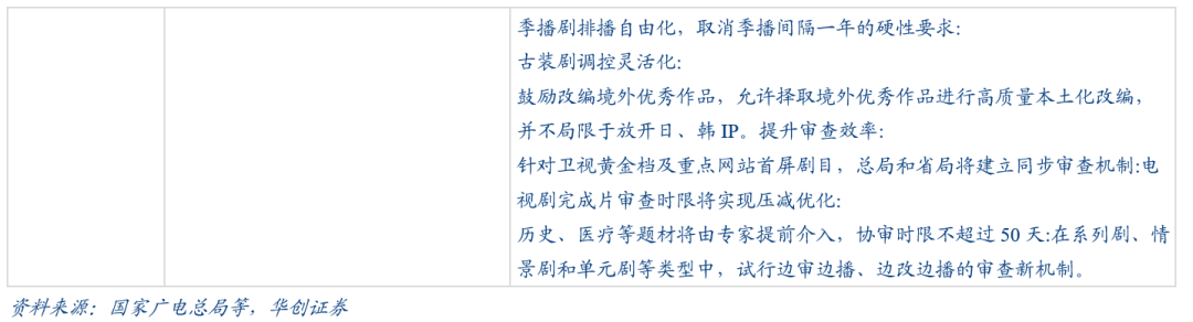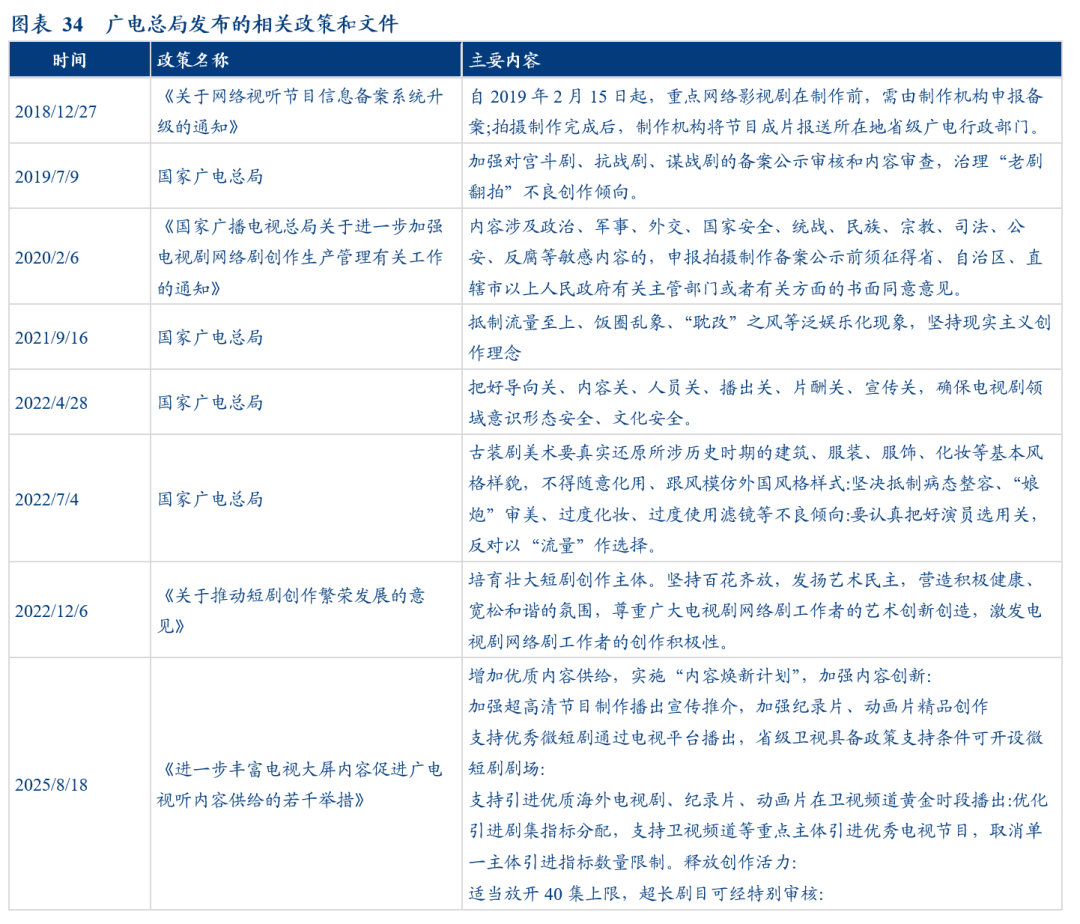 25年8月,广电总局发布《关于电视剧创作的若干举措21条》,重点内容包括:1)取消集数40集上限&季播剧需间隔1年播出的时间限制;2)放松改编剧集的题材及国别(允许翻拍日韩等境外优秀作品);3)放松古装剧播出数量限制;4)缩短审查周期(建立总局与省局同步审查机制,完成片审查时限压减至30天反馈意见)等;5)加强纪录片、动画片精品创作;鼓励精品微短剧进入电视播出;6)试点电视剧中插广告(电视台每集可中插一次不长于30秒的剧情或商业广告);7)鼓励剧集网台联动、一剧多星;8)系列剧、情景剧和单元剧试行边审边播、边改边播;9)出台问题艺人分级分类处置的机制,加强节目版权保护等。