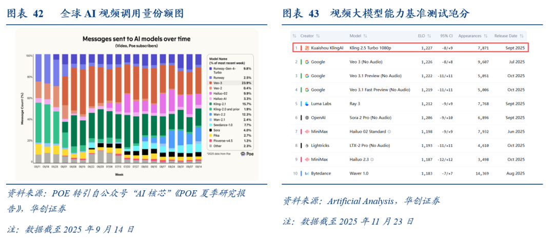 【快手】:AI视频生成工具龙头“可灵” 生态赋能(通过多模态AI提效广告、电商、短剧等业务,间接带动收入)双轮驱动。根据Poe统计数据,截至25年三季度,可灵模型调用量的市场份额暂居全球第二;第一名是谷歌Veo家族。考虑到可灵的全球竞争卡位和变现优势,建议逢低布局作为AI应用赛道的配置标的。