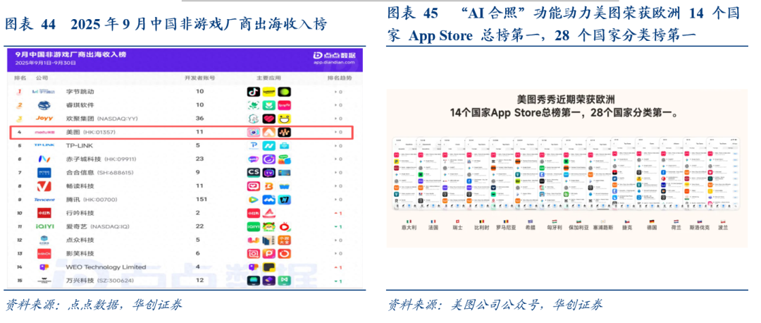 【美图公司】:行业beta和自身alpha兼具的绩优垂直应用龙头,9月中国非游戏厂商出海收入榜位列第四,继续看好出海飞轮效应。行业方面,全球内容创作工具市场正向“订阅制、轻量化、协同性”转型,部分功能也在向 “AI原生”跃迁,美图生成式AI在图像/视频领域兼具行业β收益。公司层面,美图国内格局稳健(MAU1.8亿,美图秀秀市占率近60%),用户增量来自海外(MAU近1亿,还在持续拓展)。25年加速全球化战略,用小功能撬动社交效果——AI换装、AI闪光灯等功能接连在东南亚、欧美多国登顶AppStore榜首,基于AI的差异化产品力具备全球爆款复制能力。