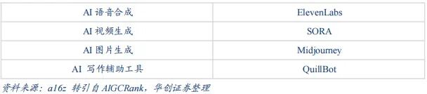 泛娱乐方向:以AI能力满足各类娱乐需求,商业化上主要通过C端变现。近两年经历过游戏、音乐、聊天陪伴等多方向的探索,但除了聊天陪伴以外(见附录,a16z AI应用榜单前列基本只有聊天陪伴一种泛娱乐产品形态),其他方向过去一年或仍然缺少兑现。我们认为泛娱乐方向,需要提供高质量的用户产品体验,产品形态仍在探索中,部分商业化初现曙光。