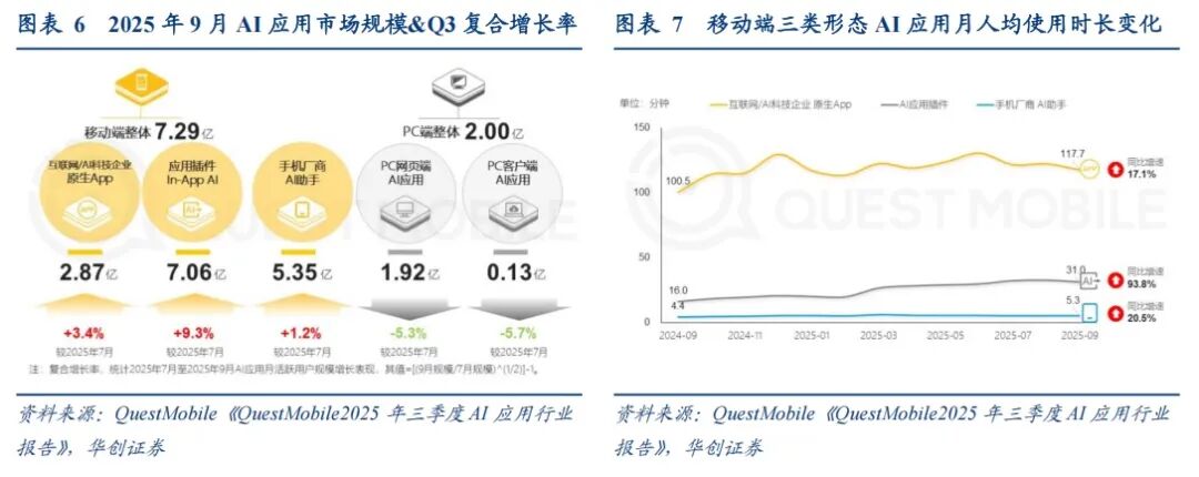 2025年9月,移动端整体规模突破7亿(原生App In-App AI),手机厂商AI助手规模达5.35亿,PC端应用整体规模2.00亿。原生App整体规模2.87亿,Q3复合增长率3.4%;In-App Al整体规模7.06亿,Q3复合增长率9.3%;手机厂商AI助手Q3复合增长率1.2%;PC网页端应用整体规模1.92亿,Q3复合增长率-5.3%;PC客户端应用整体规模0.13亿,Q3复合增长率-5.7%。移动端应用内部格局固化,原生App入局窗口收窄,In-App AI形态需确保入口的前置化 场景化。