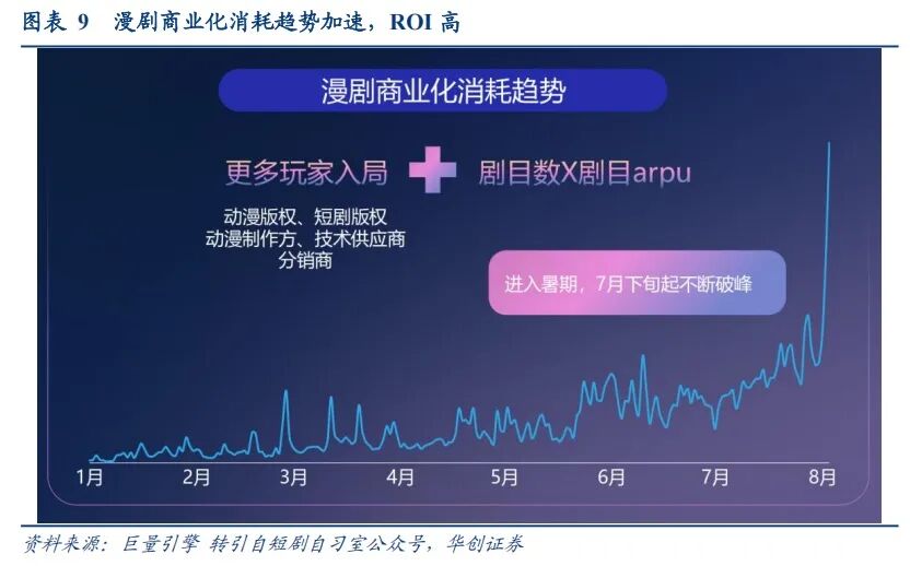 举例来说,漫剧成为泛娱乐领域增速快,AI商业化模式跑通的新兴方向之一。根据巨量引擎数据,2025年上半年,漫剧供给量以83%的复合增长率持续扩容,近半年的周均在投漫剧剧目数超过110部,累计上线3000部,环比增长603%,整体市场规模预计在2025年再创新高;漫剧相关企业数量也同样在呈指数级扩张,预计将突破数十万家。反映漫剧播放量与商业化程度的关键指标——每日广告投放消耗(日耗)半年内从大几百万到逼近千万级。同时,AI漫剧的测出率(内容测试成功并能起量的比率)高达50%-75%,远高于传统短剧,这使得创作者能够以更低的风险进行内容试错。制作成本方面,根据私域神器相关信息,AI漫剧的单部制作成本或已降至10-15万元,仅为传统短剧50-80万元的四分之一左右,生产效率提升至每月约20-30部(包括动态漫 沙雕漫)。