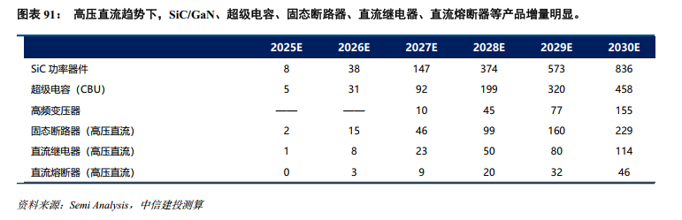 从核心零部件来看,1)在高压直流趋势下带来增量需求,超级电容、固态断路器、直流继电器、直流熔断器等产品增量明显;2)功率器件方面,HVDC系统中,功率器件价值量占比最高,将在2025年之后得到快速增长,尤其可以看到SiC功率器件需求将快速达到百亿级别;SST系统中功率半导体器件成本占比最高,SiC基本成为必选项,进一步拉动第三代宽禁带半导体需求。