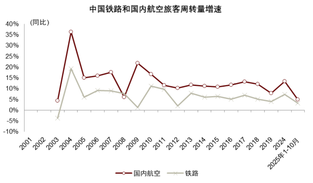 我们预计2025年民航旅客周转量同比增加8%,保持较快增长。2025年前10个月,行业整体旅客周转量同比增加8.2%,其中因私需求保持平稳较快增长,而公商务旅客有所波动。