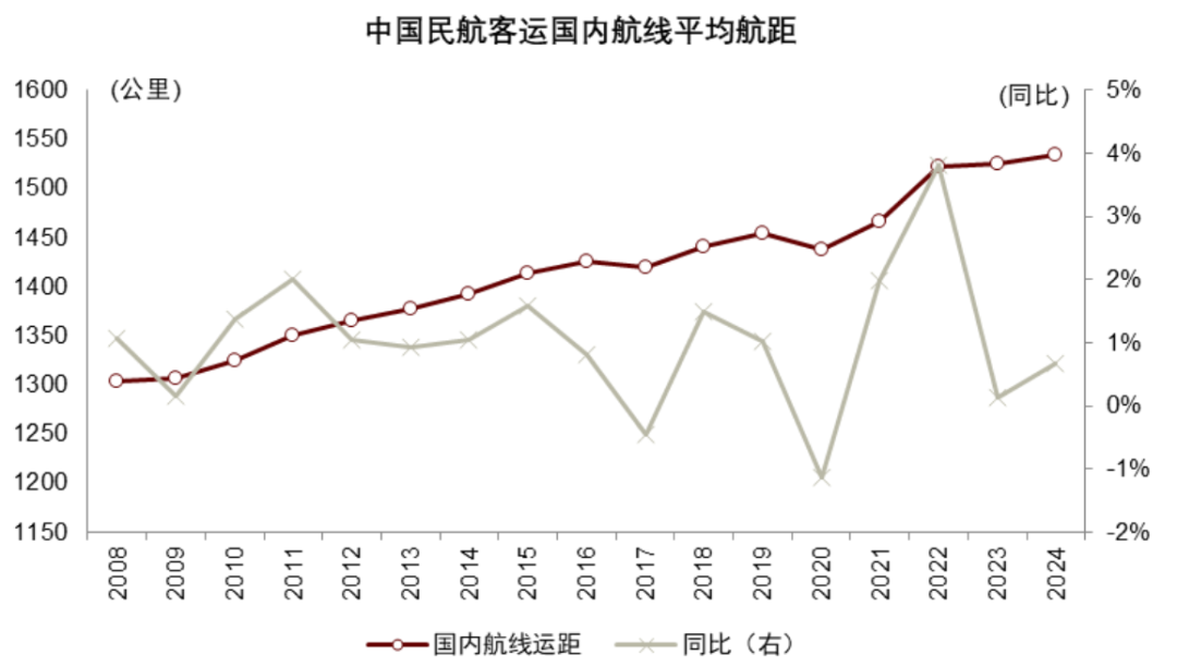 图表11:国内航空运距不断拉长,2024年已超过1500km,与高铁错位竞争