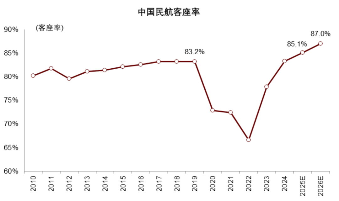 我们预计2026年客座率约为87%,继续较2025年提升2个百分点,再创新高。从航空公司运营角度看,2025年8月和10月份客座率均超过87%,说明航空公司超高客座率运营的可行性。从供给角度看,2026年的供给相对需求更为紧张,客座率不得不提升以满足旅客需求。