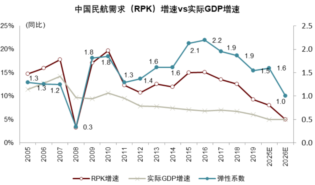 短期看,2026年实际航空需求相对实际GDP增速的弹性系数会降低,原因在于供给压制。弹性系数的降低反而说明有部分潜在需求没有被满足,航空市场存在较明显供不应求的情况,我们相信这将会是2026年甚至往后几年里的常态。