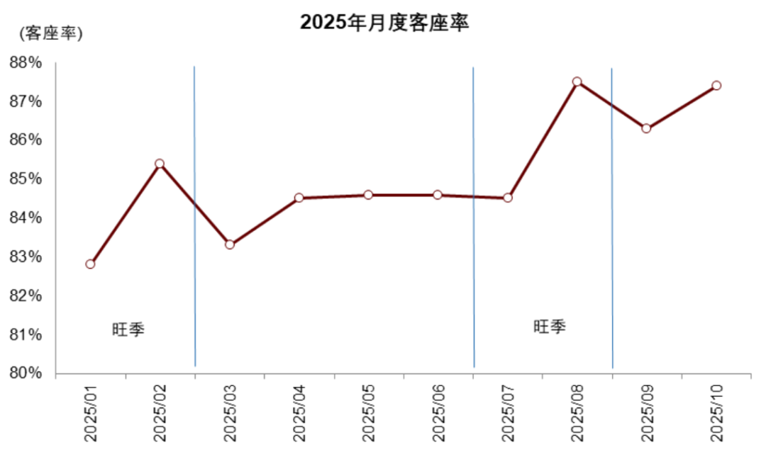 什么导致了高客座率?两方面原因:(1)航空公司部分时间段采取“以价补量”的收益策略,提升客座率和客运量;(2)阶段性的供给紧张抬升客座率(例如2025年10月需求较旺盛但供给受压制,客座率在淡季月份创新高)。